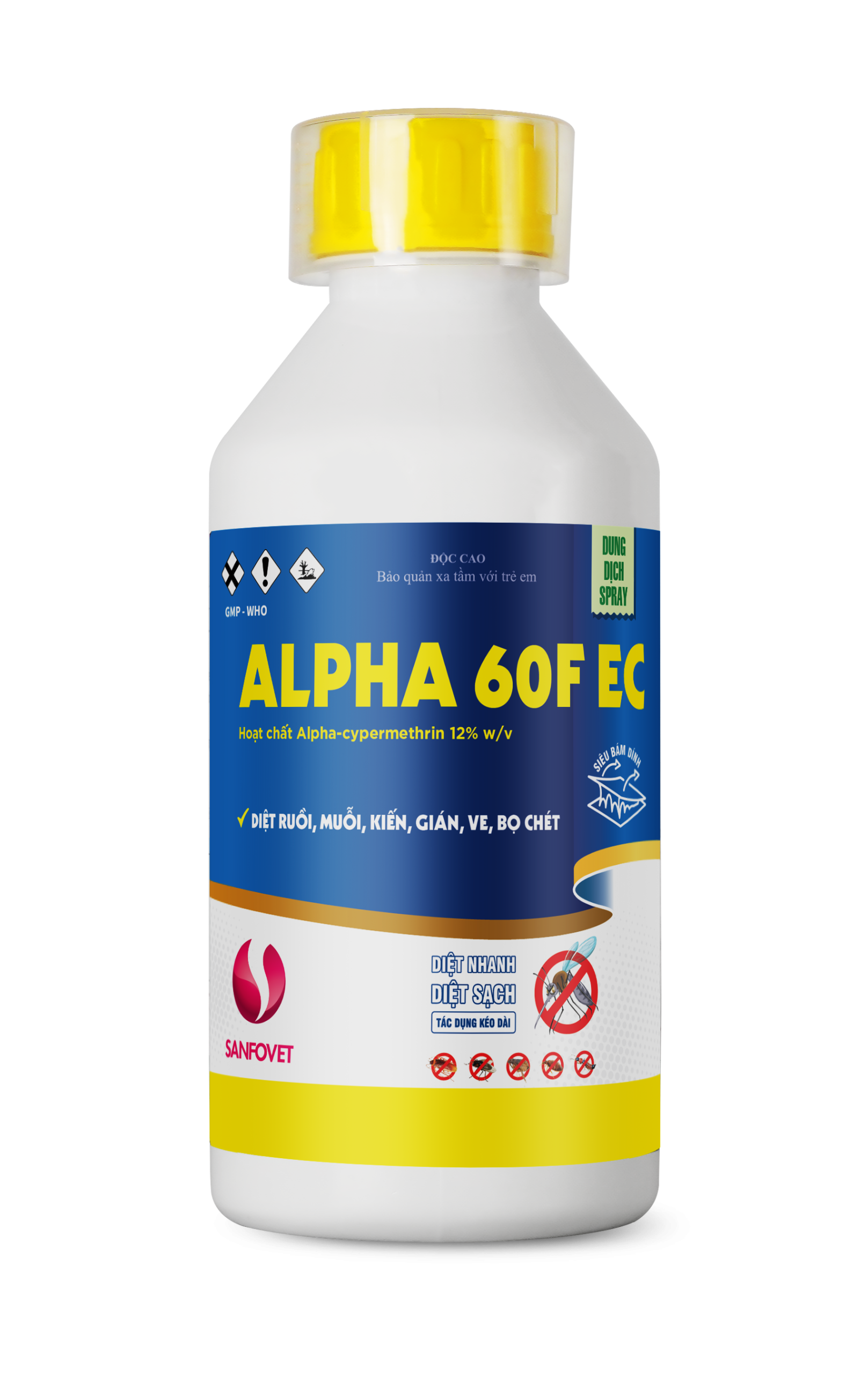 ALPHA 60F EC phòng trừ và diệt ruồi, muỗi, gián, rệp, kiến cho chuồng trại, nhà cửa, kho vựa. Diệt ve, ghẻ và bọ chét,… trên vật nuôi giúp phòng chống các bệnh: Tải xanh, LMLM, Dịch tả trên heo, Ký sinh trùng đường máu trê gà, vịt…