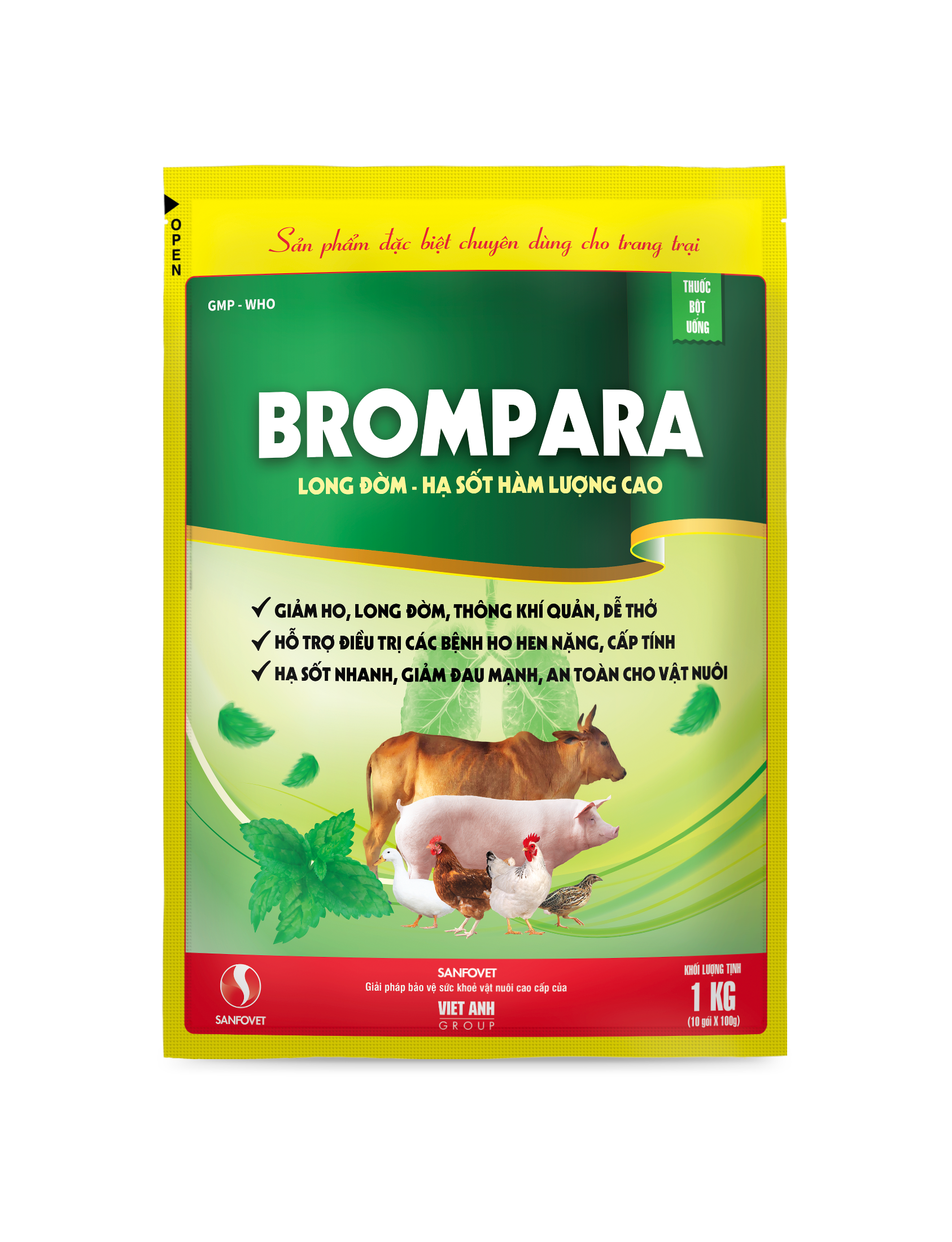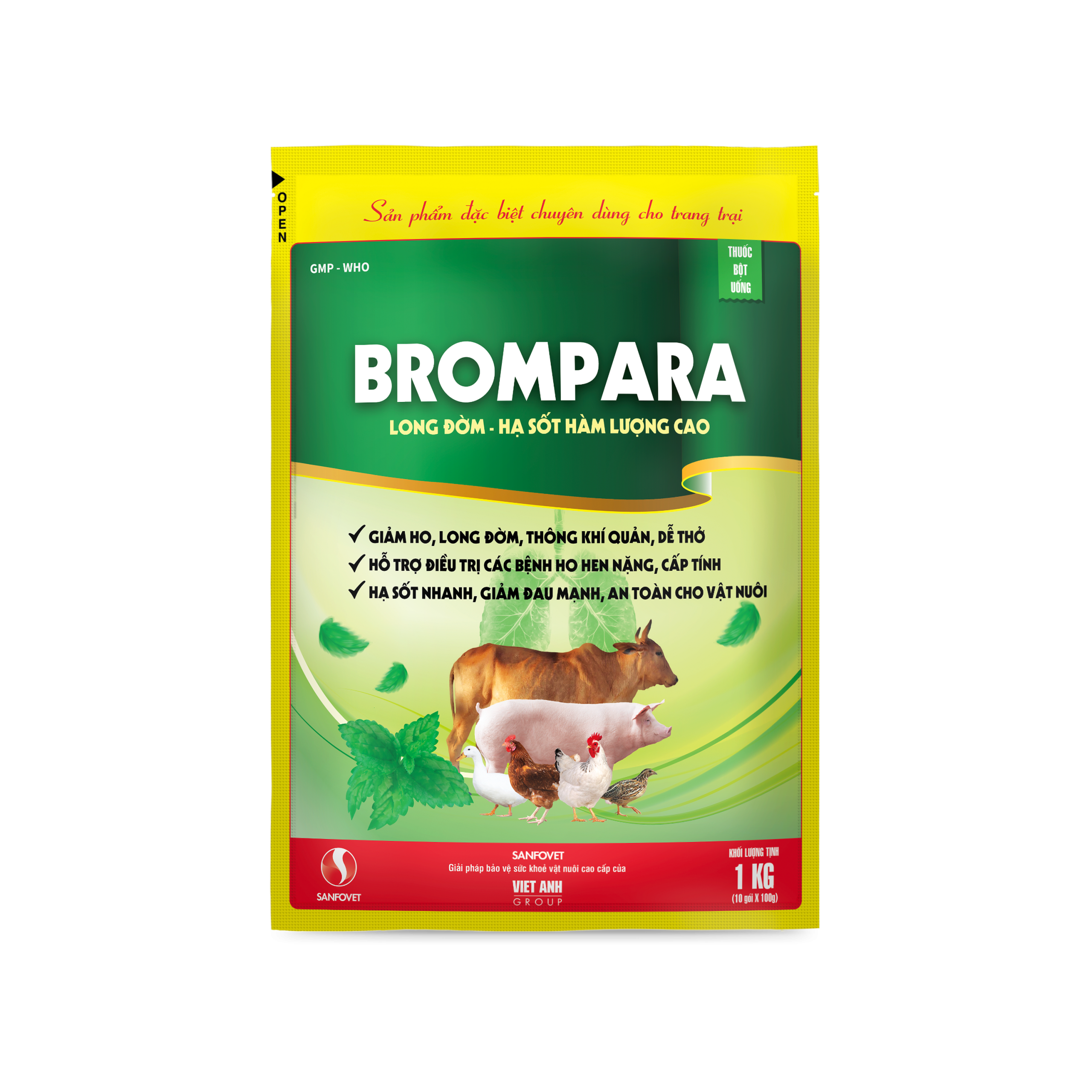 – Điều trị các triệu chứng gây viêm nhiễm đường hô hấp trên Heo, trâu, bò, dê, cừu, gà, vịt, chim cút. Giúp giảm ho, giảm hen, long đờm, thông khí quản, dễ thở. Chống co thắt phế quản trong các bệnh gây viêm phổi, ho, khó thở, hen suyễn. Bệnh hen khẹc, vảy mỏ, hen ngáp gió do CRD, CCRD, CORYZA. IB, ITL,… Tăng hiệu quả khi kết hợp cùng với kháng sinh trong điều trị bệnh.