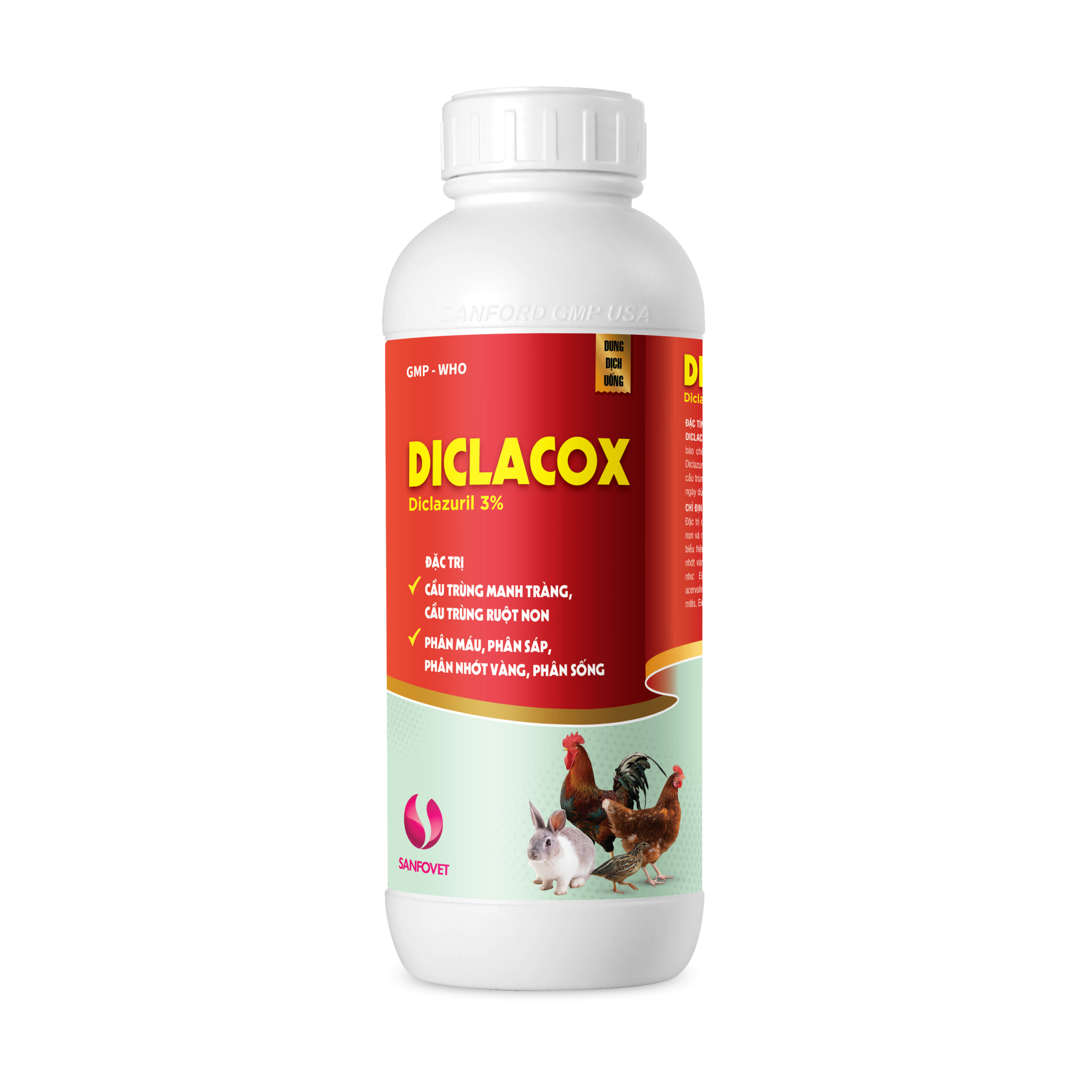 DICLACOX là thuốc đặc trị bệnh cầu trùng được bào chế theo công thức đặc biệt, với hoạt chất Diclazuril hàm lượng cao, diệt sạch tất cả các loại cầu trùng thường gây bệnh trên gia cầm, chỉ sau 2 ngày dùng thuốc.