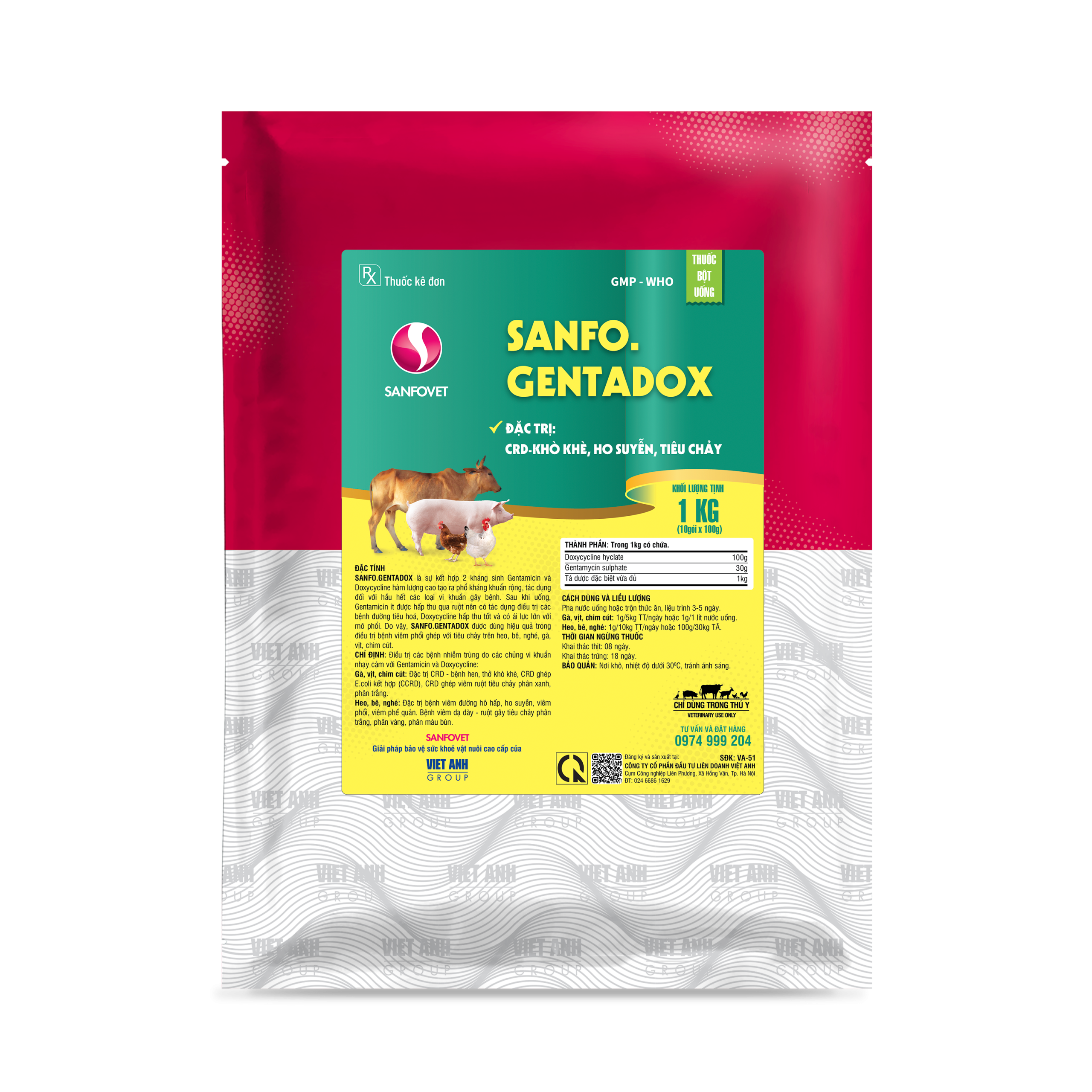 SANFO.GENTADOX là sự kết hợp 2 kháng sinh Gentamicin và Doxycycline hàm lượng cao tạo ra phổ kháng khuẩn rộng, tác dụng đối với hầu hết các loại vi khuẩn gây bệnh. Sau khi uống, Gentamicin ít được hấp thu qua ruột nên có tác dụng điều trị các bệnh đường tiêu hoá, Doxycycline hấp thu tốt và có ái lực lớn với mô phổi. Do vậy, SANFO.GENTADOX được dùng hiệu quả trong điều trị bệnh viêm phổi ghép với tiêu chảy trên heo, bê, nghé, gà, vịt, chim cút.