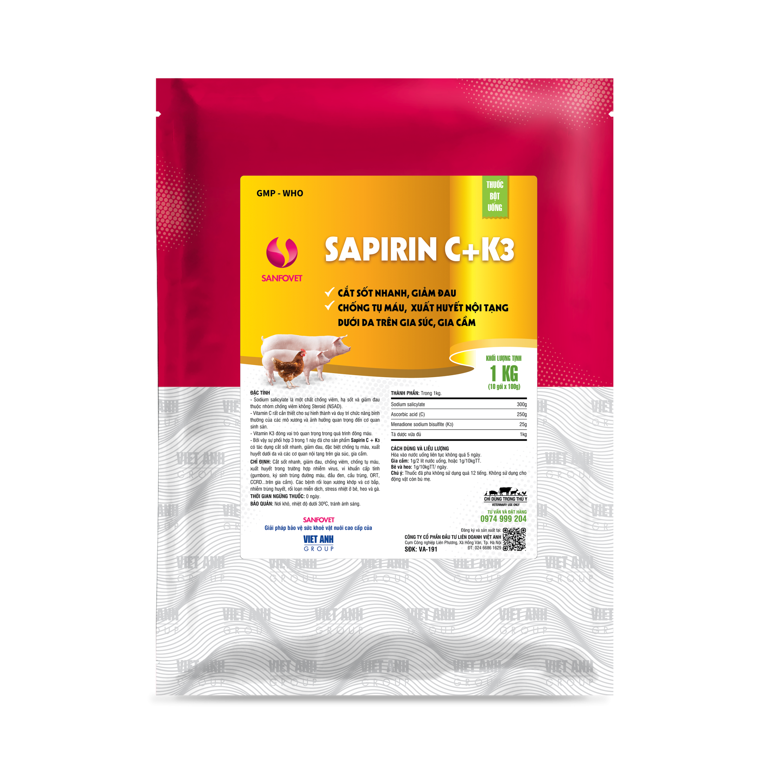 – Bởi vậy sự phối hợp 3 trong 1 này đã cho sản phẩm SAPIRIN C+K3 có tác dụng cắt sốt nhanh, giảm đau, đặc biệt chống tụ máu, xuất huyết dưới da và các cơ quan nội tạng trên gia súc, gia cầm.