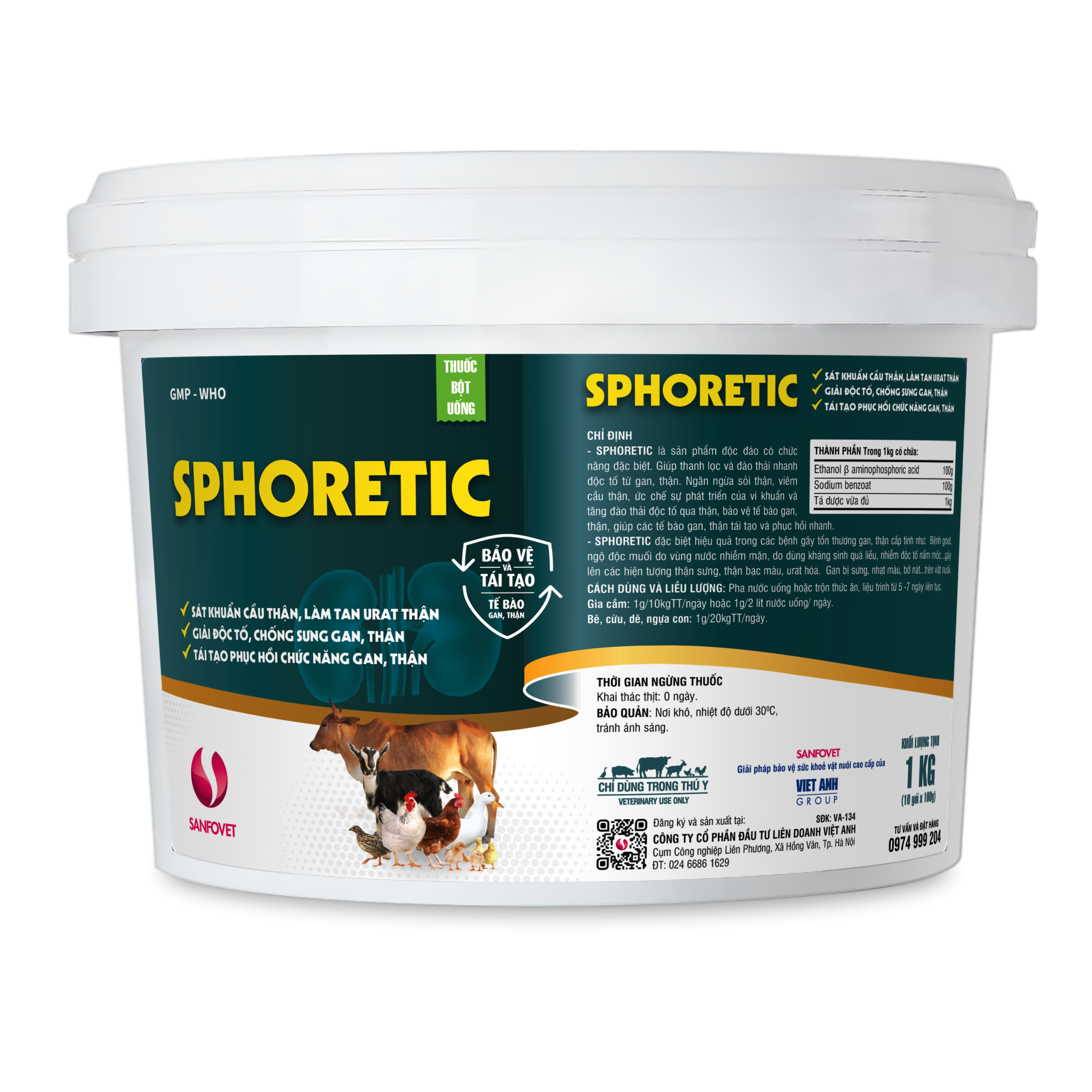 – SPHORETIC đặc biệt hiệu quả trong các bệnh gây tổn thương gan, thận cấp tính như: Bệnh gout, ngộ độc muối do vùng nước nhiễm mặn, do dùng kháng sinh quá liều, nhiễm độc tố nấm mốc,… gây lên các hiện tượng thận sưng, thận bạc màu, urat hoá. Gan bị sưng, nhạt màu, bở nát,… trên vật nuôi.