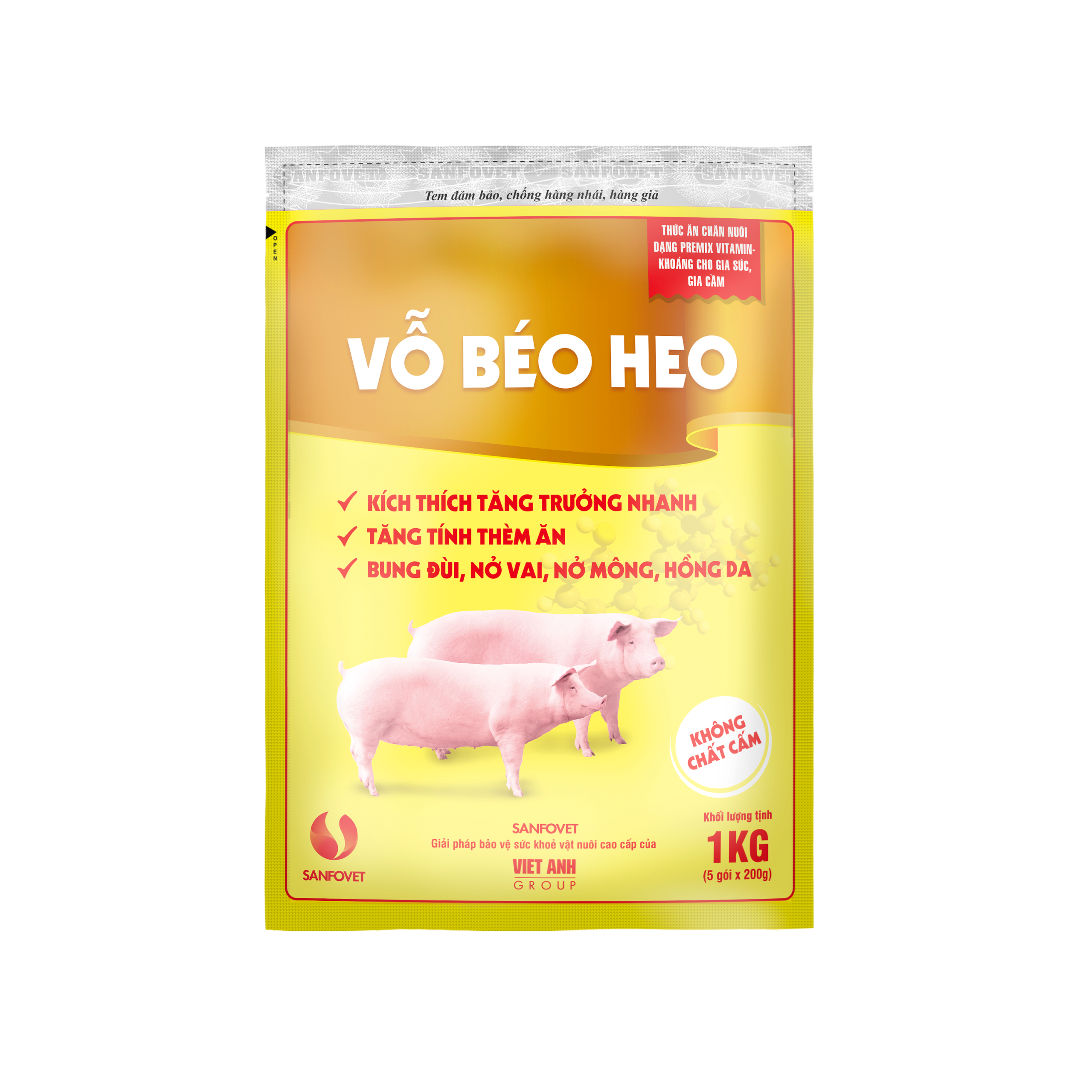 VỖ BÉO HEO là loại thức ăn bổ sung dạng bột hòa tan chứa các Vitamin, Acid amin và khoáng chất.